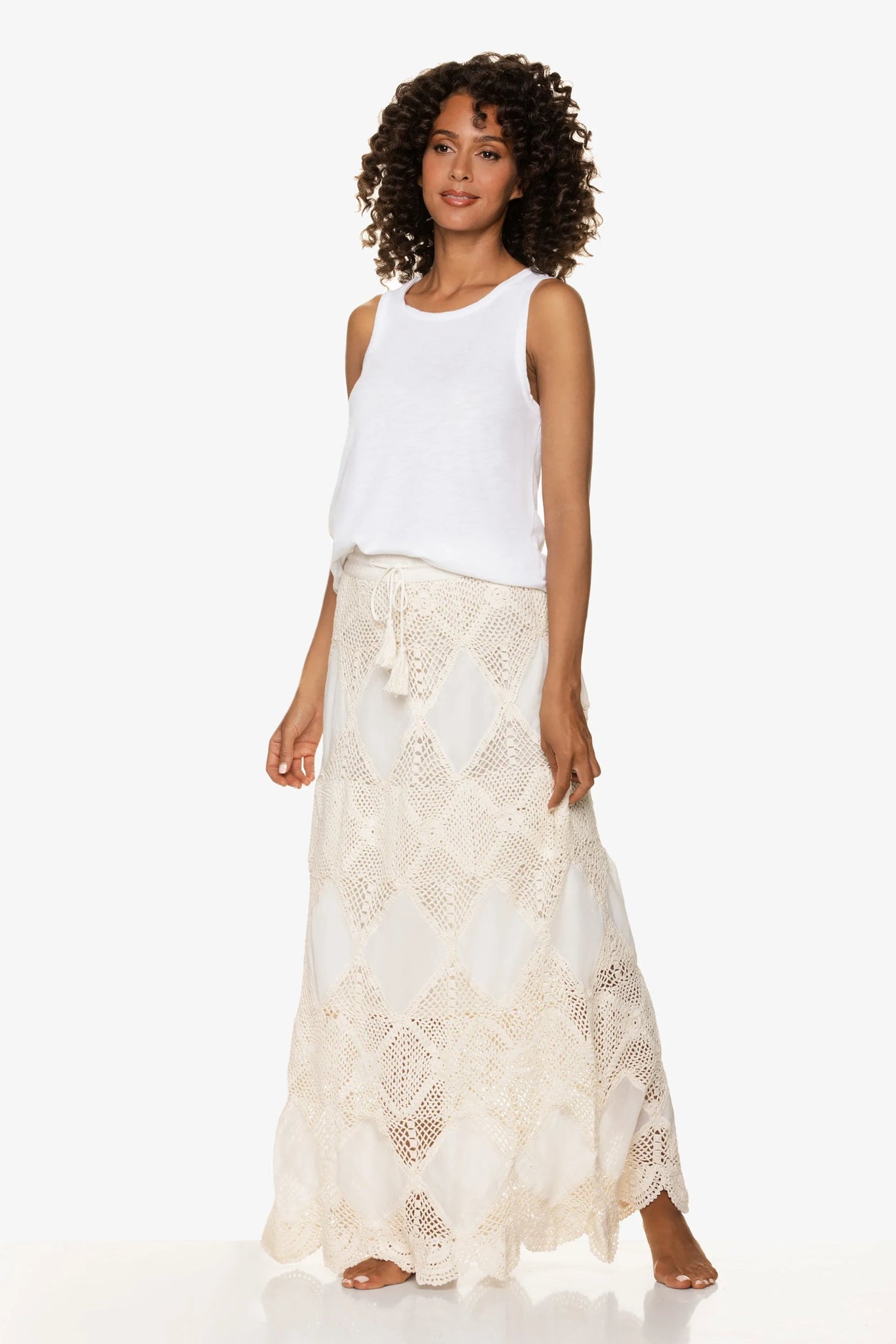 This hand-crocheted piece is beautifully made with a scalloped hem, an intricate diamond crochet pattern, and soft-tassel ties. Wear it as a maxi skirt or wear it alone as a chic bandeau dress. Neutral enough to be paired with just about anything, this luxury-meets-boho piece offers the ultimate in versatility.