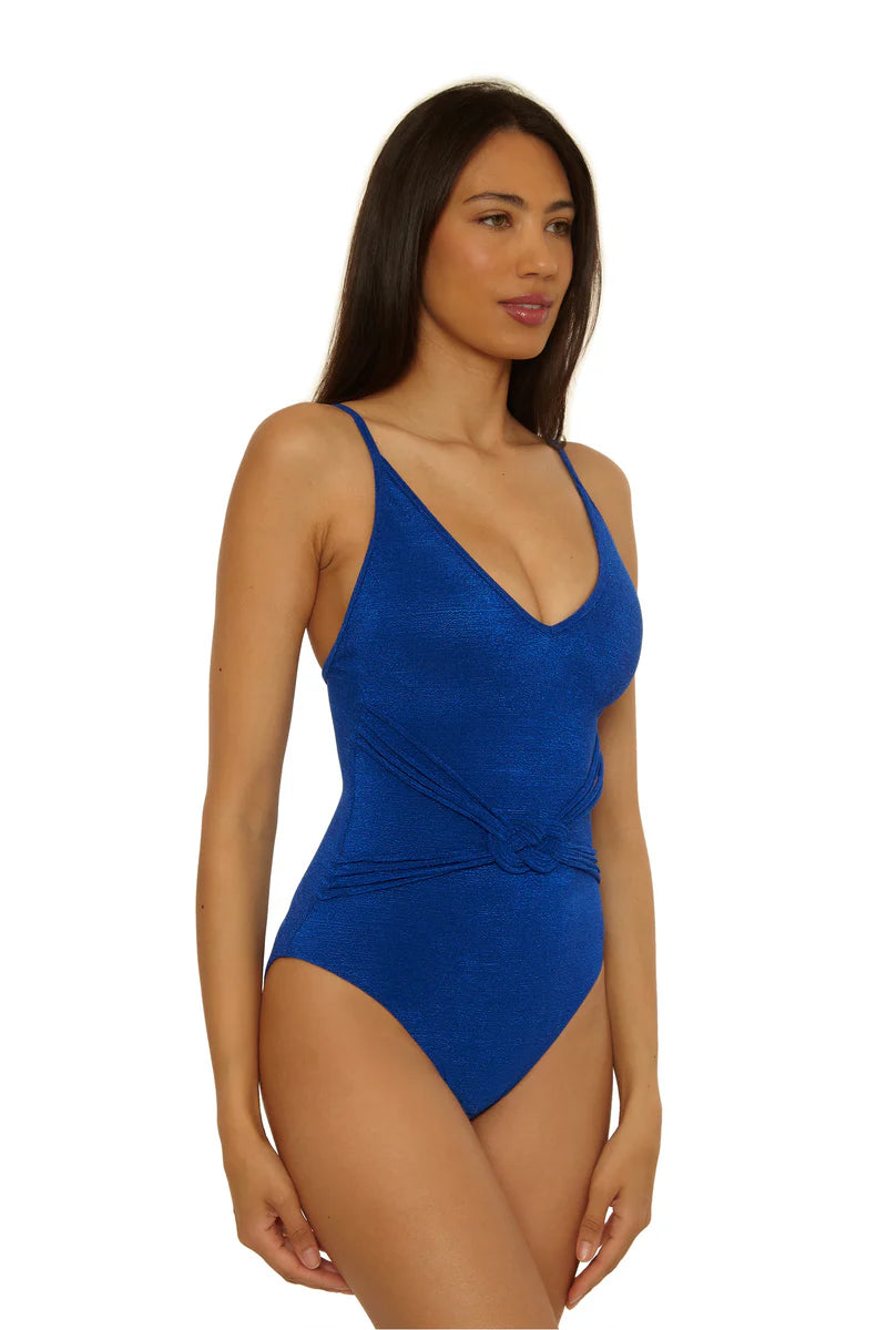 This classic beauty one-piece swimsuit features a V-neck with adjustable spaghetti straps that tie at the back. A braided belt waist creates a flattering waistline. This one-piece swimsuit will become a staple in your swim collection.