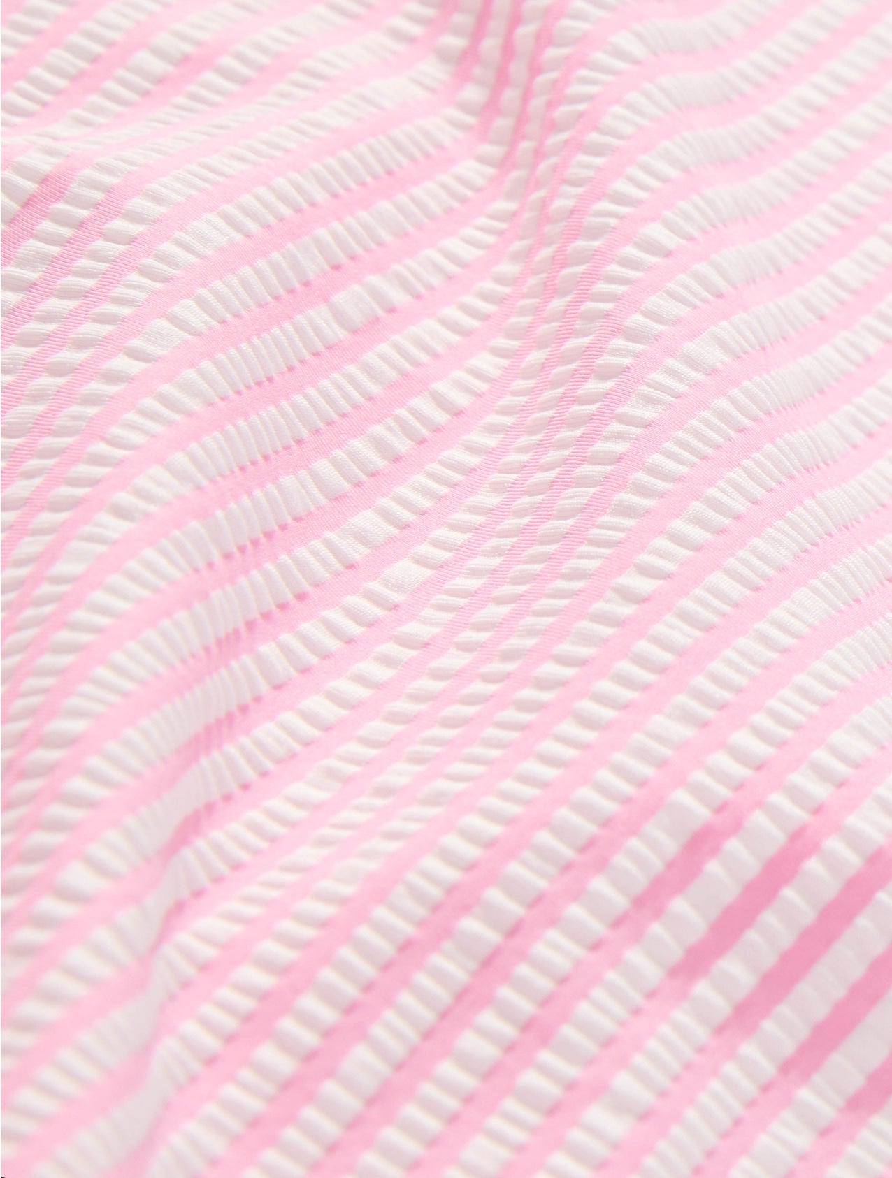 High cut and ready to strut, this high cut leg line elongates your legs with cool smocked sides. A seersucker, textured, stripe is a playful print to add to your swim collection.