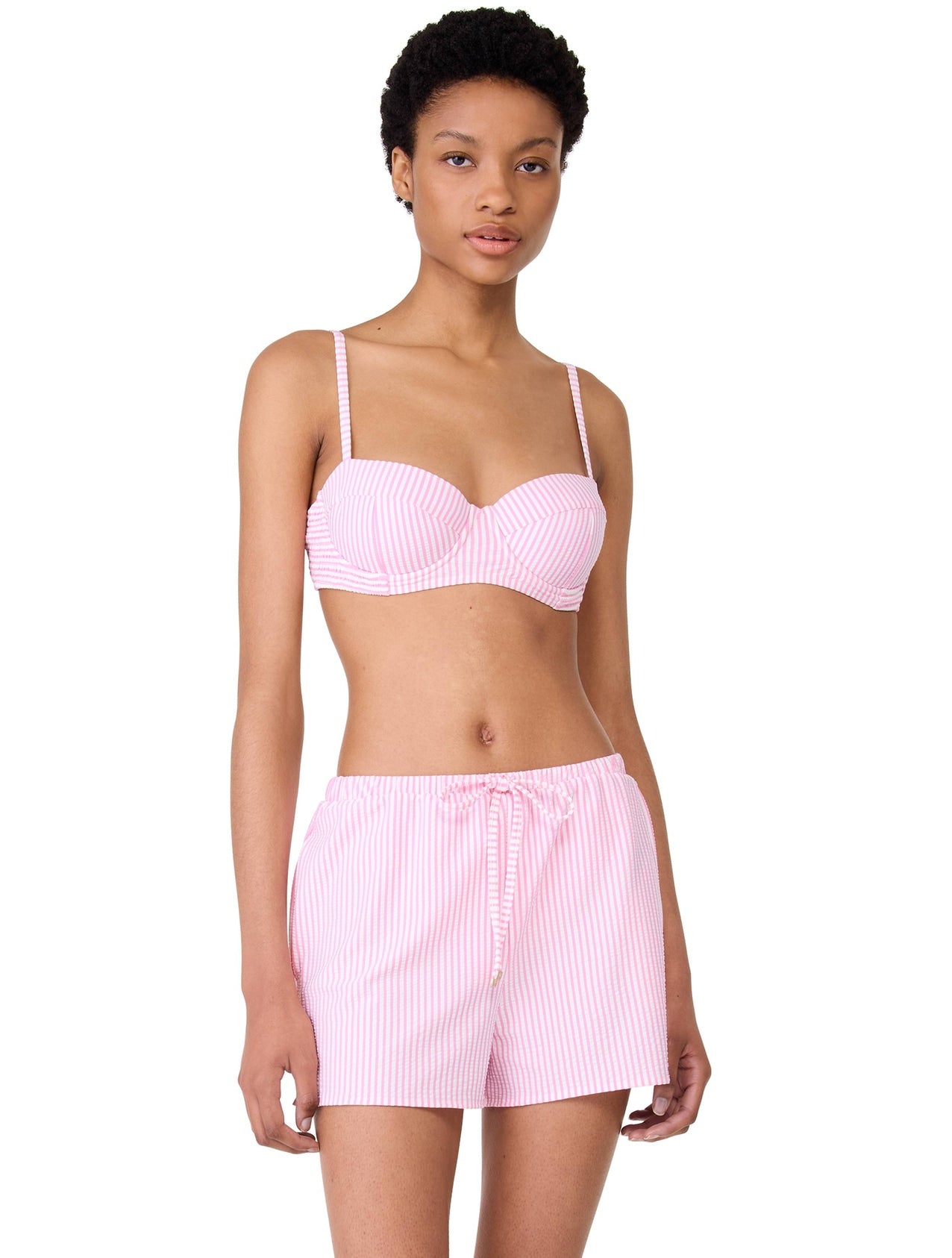 Get your sun on in this bra top with cool smocked back. A seersucker, textured, stripe is a playful print to add to your swim collection.