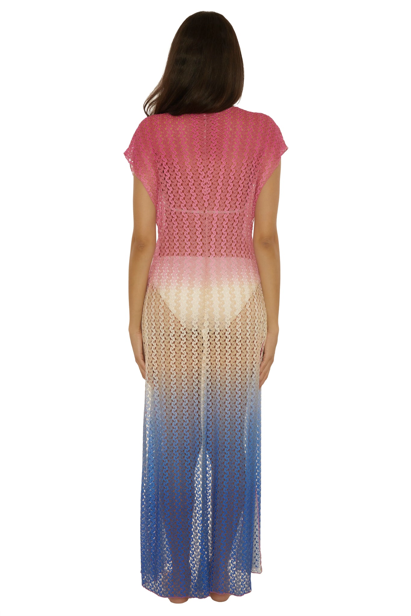 -Maxi crochet tunic robe (Sku 70239671) -Adjustable front tie | Short sleeve -Open front w/side slits -Ombre print over white/gold metallic stripe -56" from high point shoulder length -95% Nylon 5% Metallic