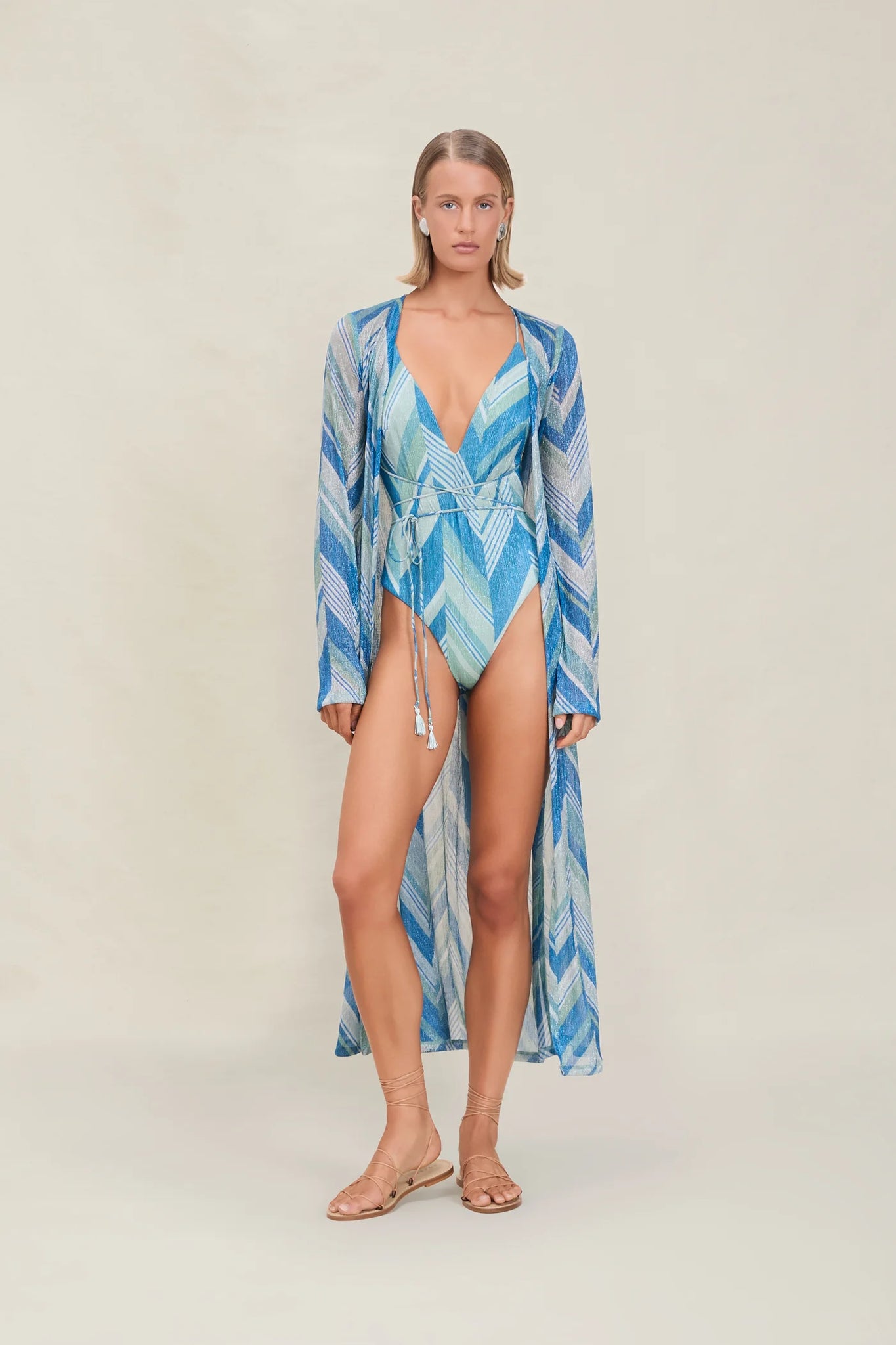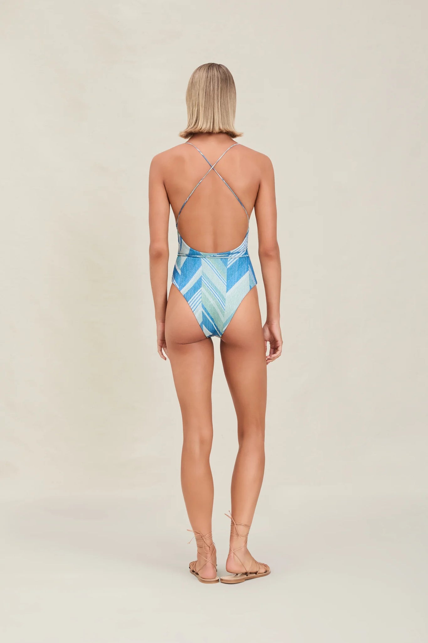 The Uchi is V-cut full-piece with thin, adjustable straps to multi-tie and tassel detailing on the straps. The Uchi has an open back and moderate coverage.